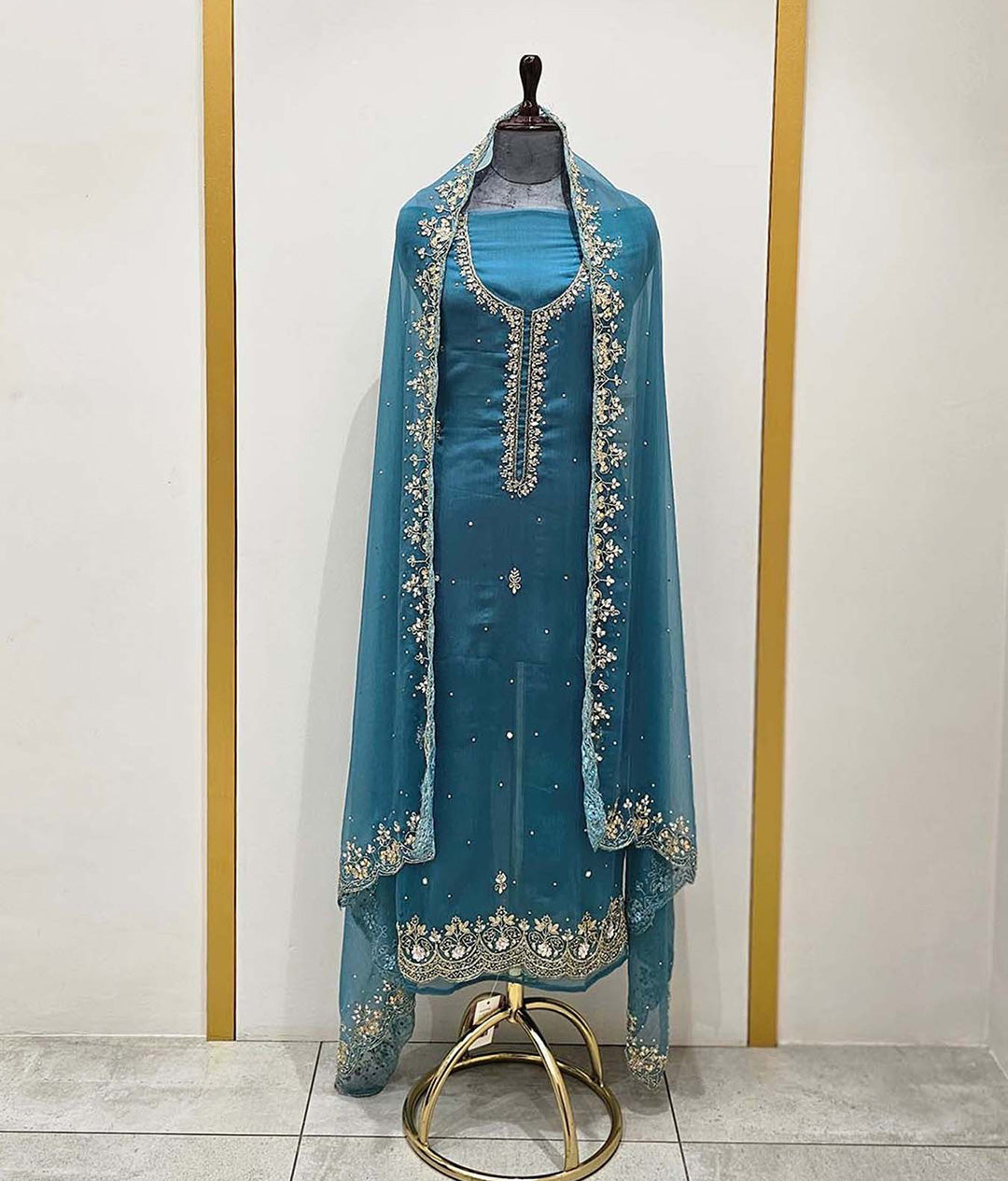 - Soft tissue georgette fabric: Top and dupatta are made in lightweight tissue georgette with a subtle sheen.