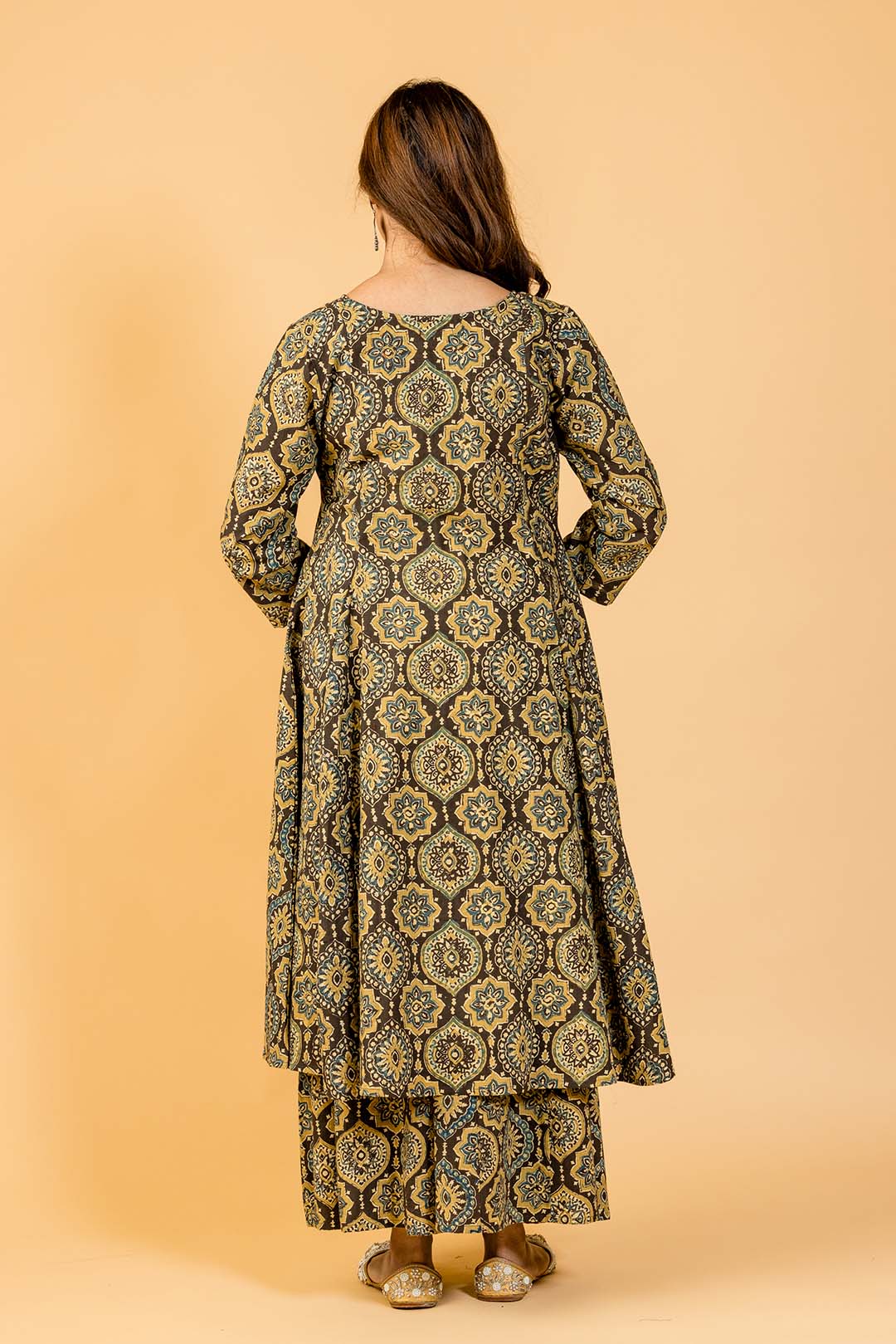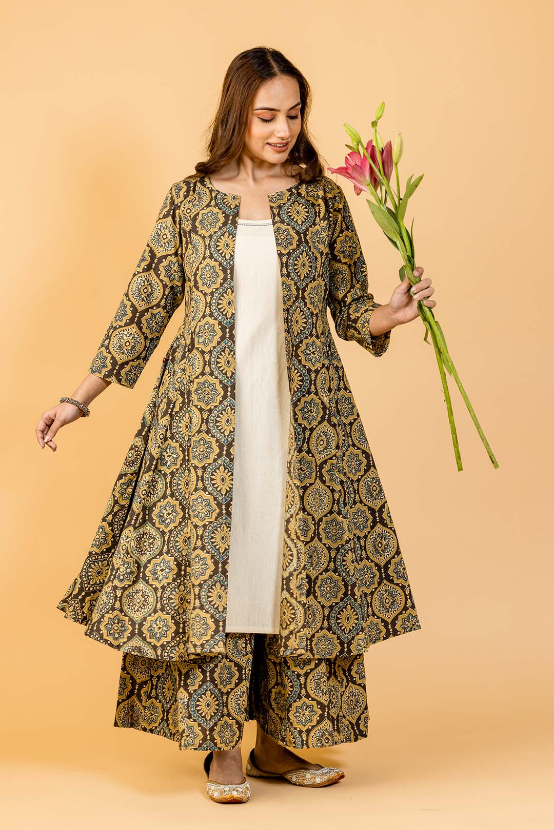 • Exquisite Ajrakh hand-block printed Kalidaar cape and flared palazzo set, showcasing traditional craftsmanship.